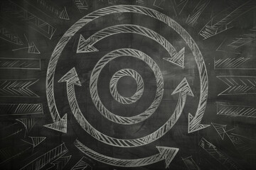 Circular arrows, endless repeating cycle drawn on chalkboard, blackboard background and texture