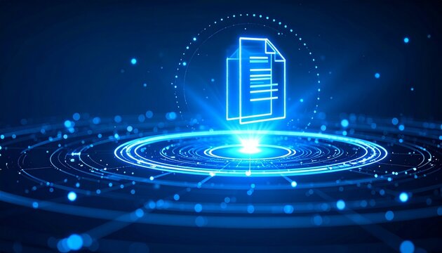 Futuristic document icon hovering above glowing digital interface in cyber environment
