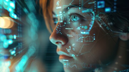 A woman's face with detailed holographic projections of data, showcasing the intersection of human features and cutting-edge digital technology.