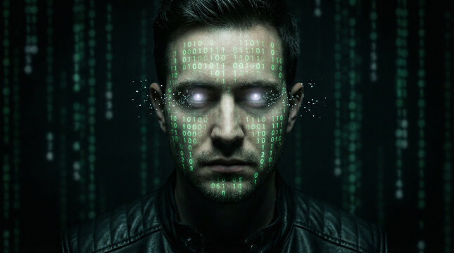 Digital displays with glowing green data create futuristic atmos