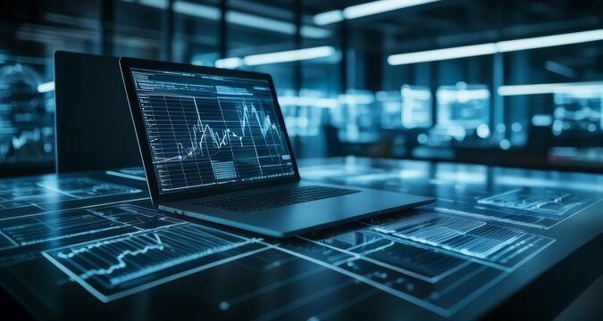 Advanced technology in action - A sleek laptop displaying complex data on a futuristic desk