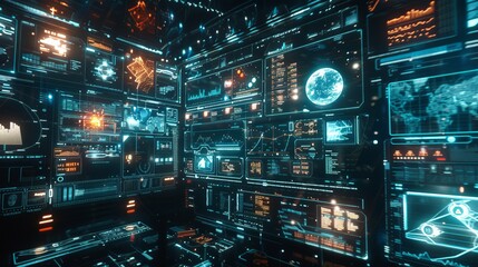 A futuristic control room filled with high-tech screens showcasing different data points and digital interfaces, symbolizing innovation and technology in the modern age.