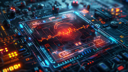 A high-tech digital interface displaying a detailed data readout with vibrant lights and intricate electronic components.