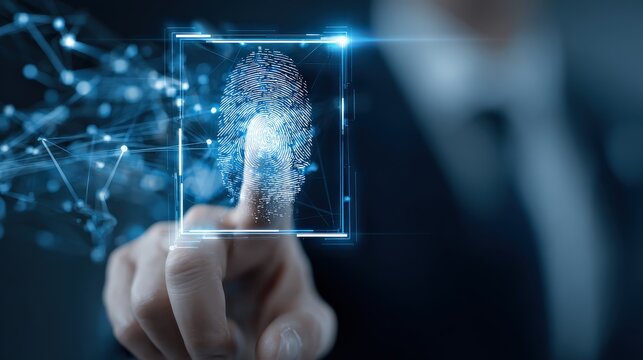 Businessmans Finger Scanning Biometric Fingerprint for Secure Digital Data Access and Cloud Analytics