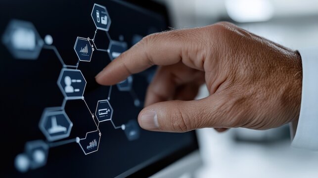 A hand interacts with a digital analytics interface, focusing on intricate hexagonal data panels, symbolizing precision and technological advancement.