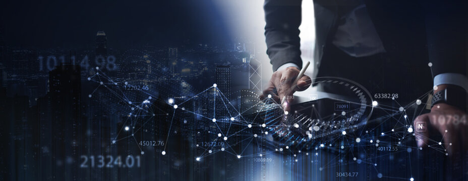 Digital technology abstract background, global business, internet network connection, Businessman using digital tablet with data analysis, digital marketing, business strategy, internet technology