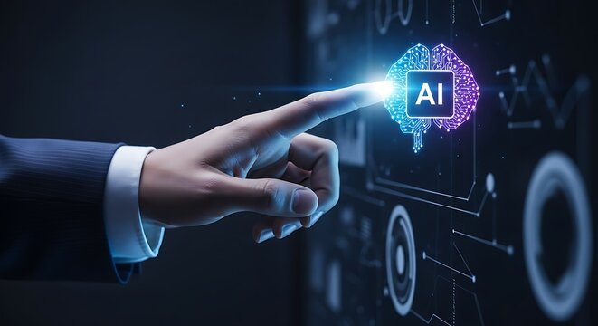 Hand touching ai brain interface on a digital screen with futuristic technology elements around it