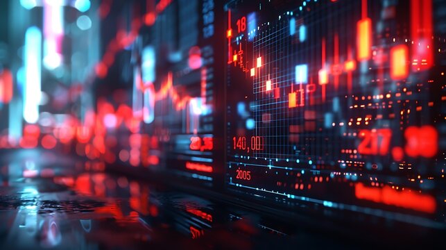 Dynamic digital stock market data displayed on a futuristic interface with glowing numbers and graphs.