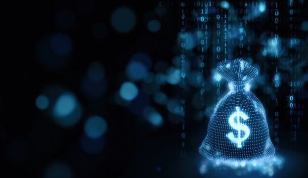 Digital currency concept: glowing money bag with dollar symbol amidst data stream