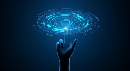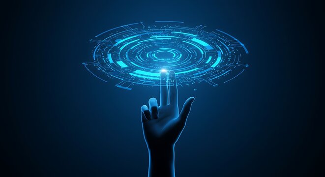 A hand interacts with a glowing, futuristic interface of concentric circles and lines.