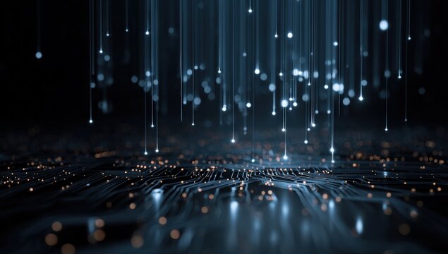 Abstract digital technology backdrop featuring a luminous blue grid pattern glowing circuit elements and futuristic geometric shapes in a deep blue gradient space data science network