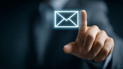 Professional businessman's finger touching glowing email icon on futuristic interface, signifying digital communication and connectivity in modern business
