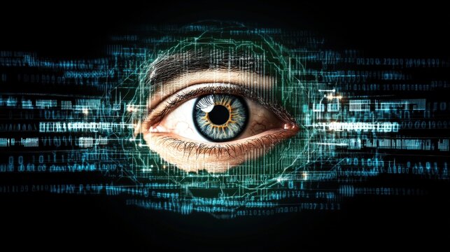 Human eye with a futuristic digital interface overlay displaying data and analytics in the background