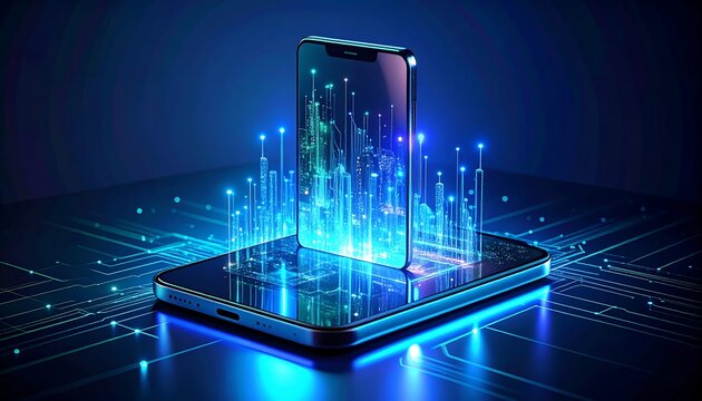 Futuristic smartphone with digital city overlay