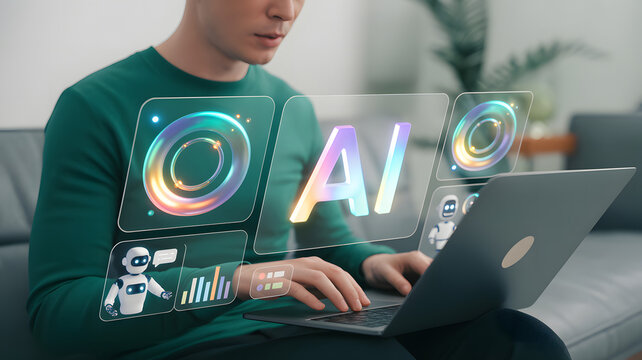 Man using laptop with ai interface showing robot and graphs in a modern digital environment setup