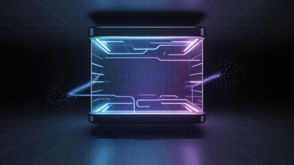 Futuristic cube with glowing neon lines and circuit patterns, a modern technology concept for digital interface and virtual reality display