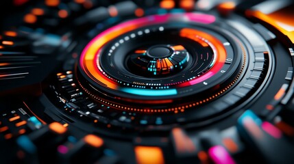 Close-up of a complex, futuristic, circular interface with glowing rings and intricate details