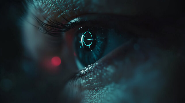Cybernetic Vision: Close-up of a woman's eye with futuristic digital data overlay, showcasing technological advancement and artificial intelligence.  A mesmerizing blend of human and machine.