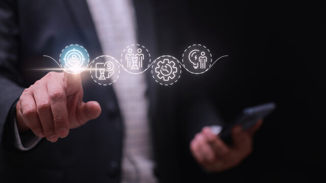 Businessman touching virtual interface for business process diagnostic analysis strategy and confident development planning