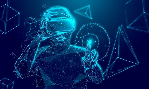 Abstract digital visualization of an illuminated holographic humanoid figure constructed from interconnected glowing circuits and data points symbolizing advanced artificial intelligence technology