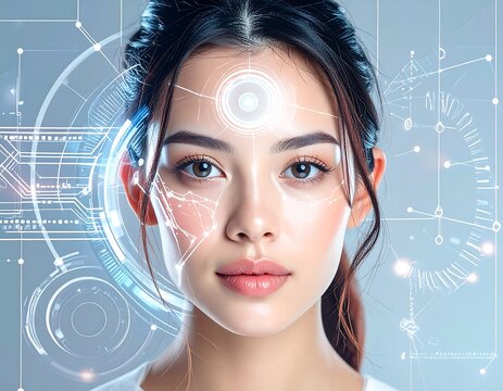 A woman's face is superimposed with futuristic, technological elements