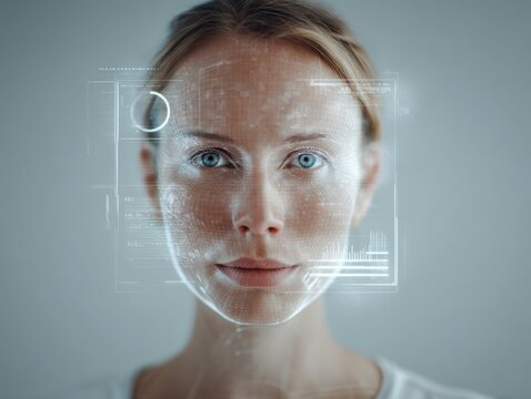 close-up of woman's face with neutral expression and direct gaze into camera overlaid with digital interface elements on smooth gray background concept of technology data analysis biometric scanning