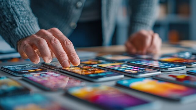 Person's hands interacting with a digital screen filled with data and user interface elements displaying information