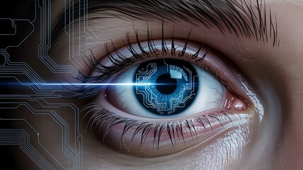 Stunningly detailed human eye merged with futuristic digital interface, representing advanced technology and vision