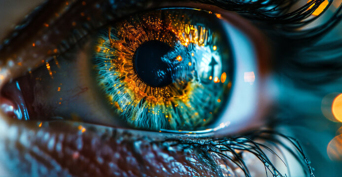 Close-up of a human eye with advanced cybernetic enhancements, symbolizing futuristic vision technology