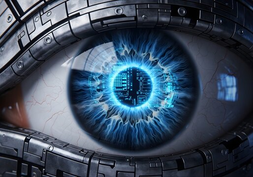 A close-up image of a human eye features a vibrant blue iris overlaid with digital interface elements, creating a futuristic, cybernetic appearance