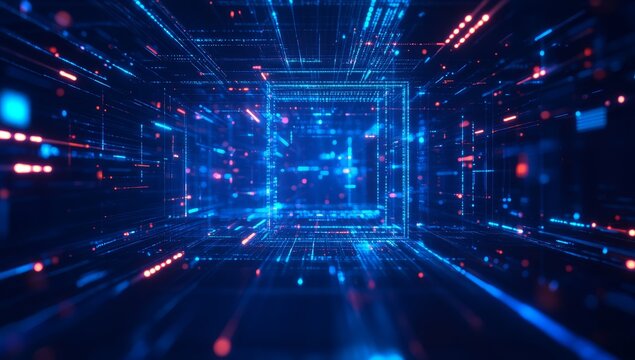 Futuristic digital network tunnel, data streams within a square, abstract background