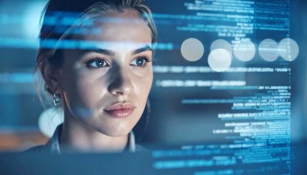 A focused woman observing data streams on a digital interface, showcasing her concentration