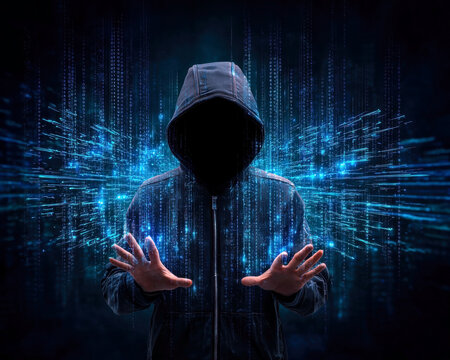 A mysterious figure in a hoodie interacts with a digital world, symbolizing the interface between humanity and technology amidst flowing streams of binary code and vibrant blue light.