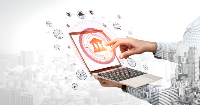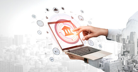 A global FinTech and digital banking network technology concept. A central financial system connected to the worldwide digital economy and services. Motif