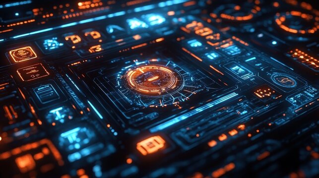 Futuristic digital interface with glowing blue and orange circuit-like elements and data visualization panels in a high-tech setting