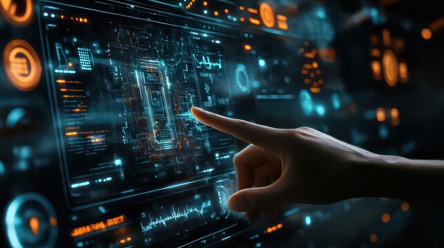 Hand interacts with futuristic digital interface, featuring glowing holographic elements and data visualization, symbolizing advanced technology and innovation