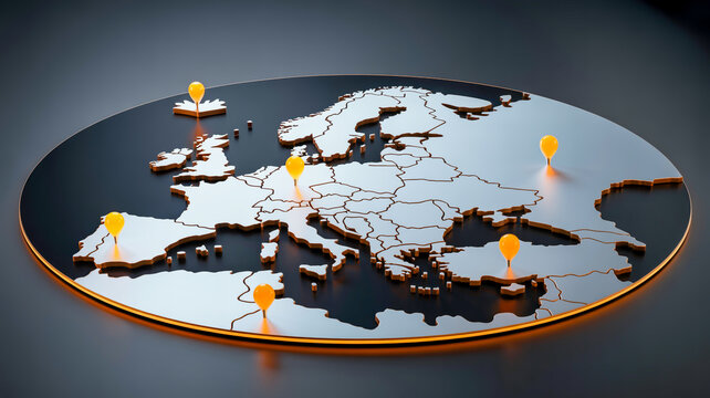 A 3D rendered dark digital map of Europe with glowing orange location markers against a black background.