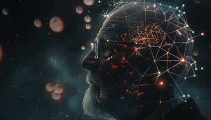 Elderly man with brain illuminated, showing signs of stroke, dementia, illness and confusion. brain dementia are checked for and analyzed in brain medicine and healthcare
