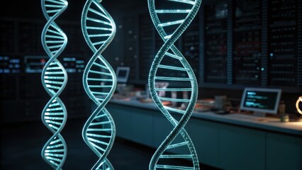 Futuristic DNA Helixes with Neon Glow in High-Tech Laboratory Environment