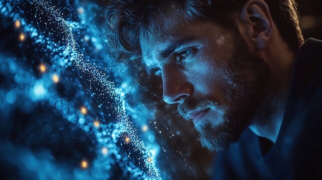 Bioengineer Examining Digital DNA Data in Futuristic Laboratory Backdrop