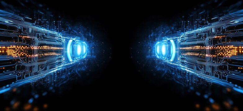 Futuristic symmetrical digital circuit panels with glowing blue and orange lights in a dark environment conveying advanced technology and cybernetic theme