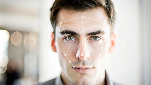 Close-up of a man"s face with digital facial recognition graphics overlay, highlighting biometric technology and security features.