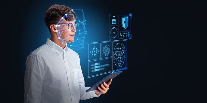 Futuristic Man Face Scan: Biometric Security and Facial Recognition Technology, AI-Powered Identity Verification, Digital Avatar Concept for Metaverse