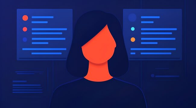 A stylized illustration of a person with a simplified face, set against a dark background featuring colorful digital interfaces and text.
