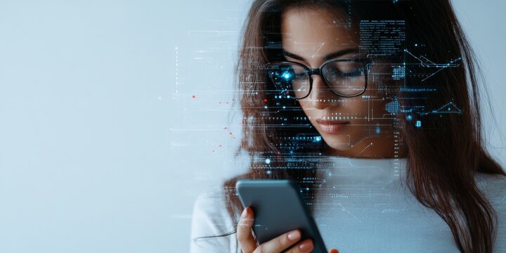 A focused woman wearing glasses is engaging with her smartphone, representing modern communication and technical interaction in a digital age concept.