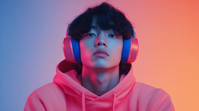 Engaged Gaming Young Man in Neon Hoodie with Headphones in Vibrant Lighting
