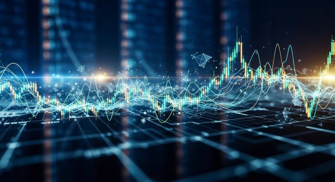 Complex financial data visualizations are displayed on a digital surface, highlighting market trends and patterns with a futuristic, dynamic aesthetic.