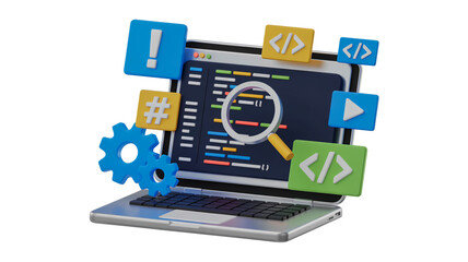 3D modern laptop with floating colorful programming and coding elements