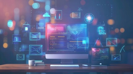Futuristic digital interface display with neon visuals