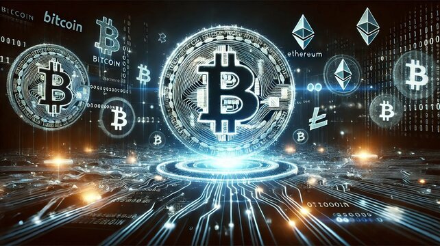 a circuit board with orange and blue glowing lines and numbers floating above it.